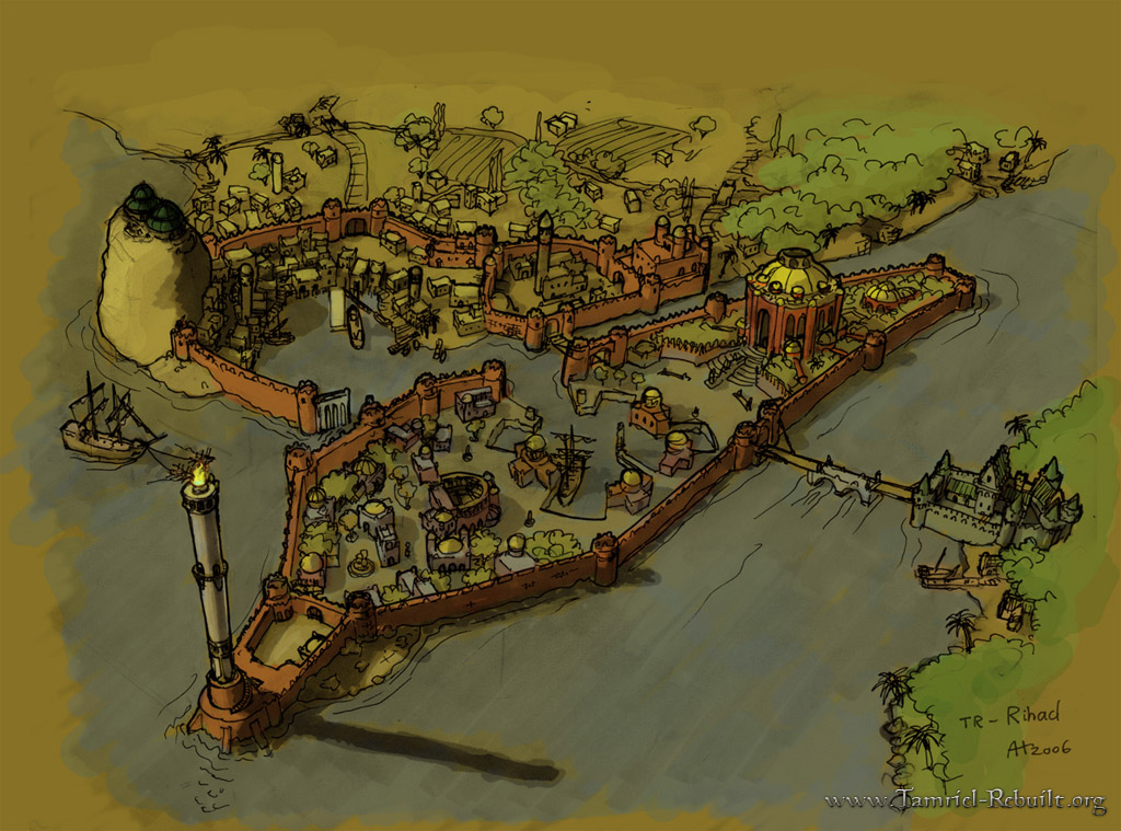 While it is not the easternmost city to be found in Hammerfell, Rihad is easily the most inviting. Its siblings further east, Dragonstar and Elinhir, are not nearly as accessible, being situated in the mountains along the borders with Skyrim and Cyrodiil; add that to the tense atmosphere of divided Dragonstar and the relative detachment of Elinhir, and Rihad becomes instantly appealing. Rihad lies amongst the rolling hills of the Goldmoor region, with its climate a pleasant mix of the Gold Coast and Colovian Highlands, tied together with the warmth of the west. It is an important port for Hammerfell, as it is closer to the rest of the world than shipping competitors such as Sentinel and Hegathe.